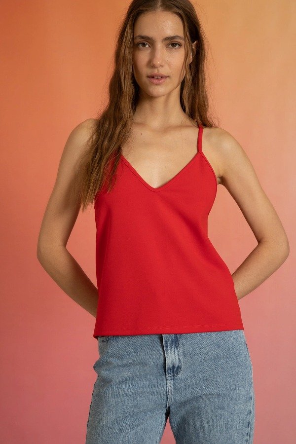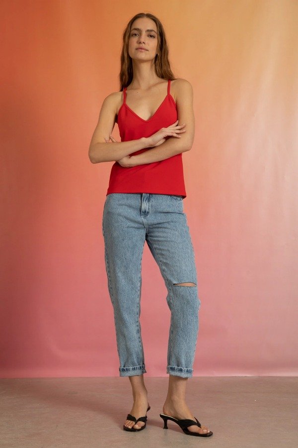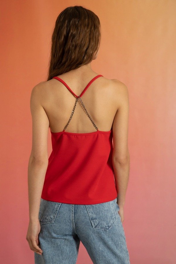 Top con breteles, escote en "v" con cadena niquel en espalda.