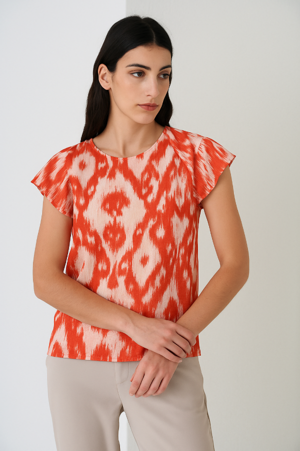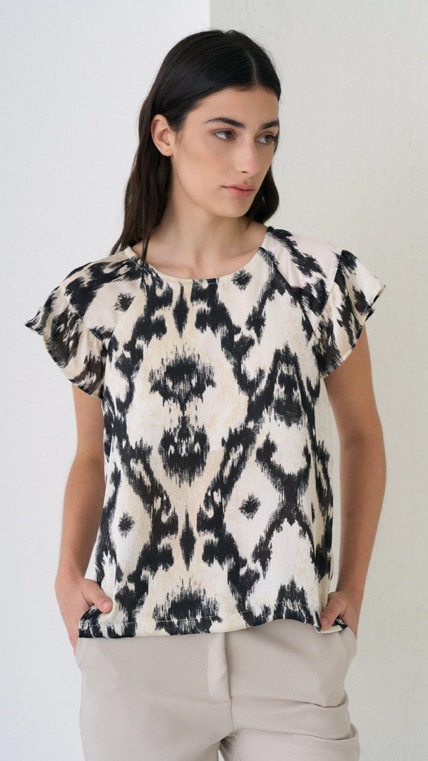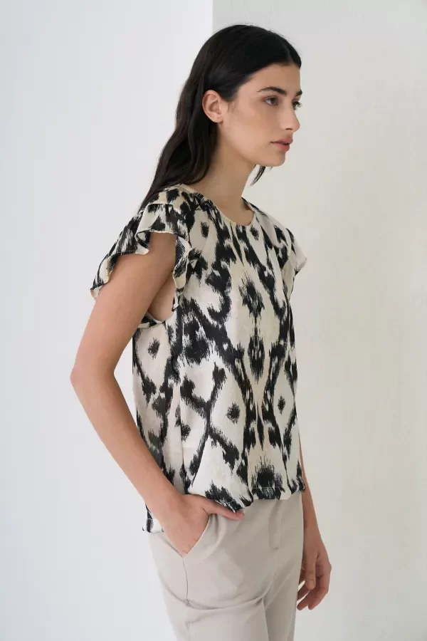 Blusa plisada estampada con volados en los hombros y lazo en la espalda.