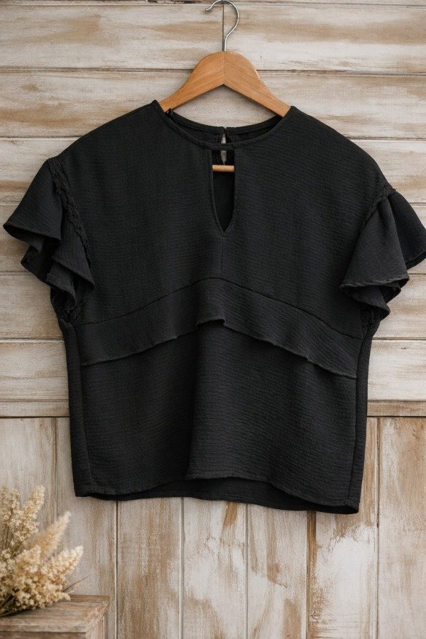 Blusa de crepe con detalle en puntilla y recorte.